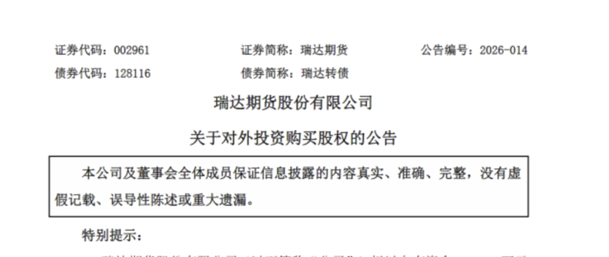 1月20日,瑞达期货公告拟斥资5.89亿元收购申港证券11.9351%股权,若交易完成,将成为第二大股东。此次收购旨在实现“衍生品投行”战略,整合资源提升综合竞争力。申港证券是首家CEPA合资券商,2025年前三季度净利润3.42亿元,经营稳健。不过,交易存在变数,部分股权质押待解除,且需监管等批准。瑞达期货自有资金充足,收购市净率约1.01倍,处于合理区间。